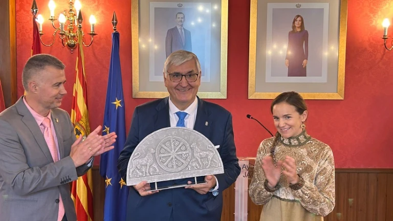 El académico y escritor ha recibido, por parte del Ayuntamiento de Jaca, una réplica del crismón de la Catedral