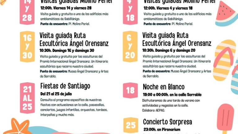 Isabel Mañero, concejal de Promoción y Turismo, subraya que "desde el ayuntamiento de Sabiñánigo hemos preparado una oferta de actividades variada para todos los públicos, a lo largo de los meses de julio y agosto, destacamos las visitas guiadas a Sabiñánigo, al molino Periel y a la ruta escultórica aire libre, que es un referente y completa la colección que se puede visitar en el museo Ángel Orensanz y Artes de Serrablo. Además, cerraremos el verano en septiembre con dos de los grandes eventos como es la BMW Motorrad Days y Pirineos Salsa Festival".