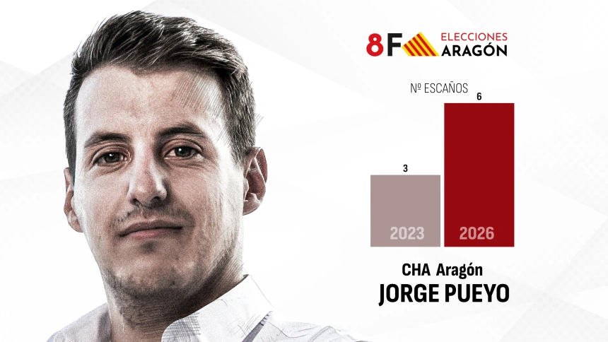El candidato de CHA a la Presidencia de Aragón, Jorge Pueyo, ha valorado el resultado electoral de su formación, que ha duplicado su representación hasta los seis diputados, como un éxito para el partido pero, a su vez, como un momento complicado para la comunidad. Pueyo ha reconocido que el resultado es bueno para su partido pero “malo para Aragón” por el auge de los escaños de Vox.