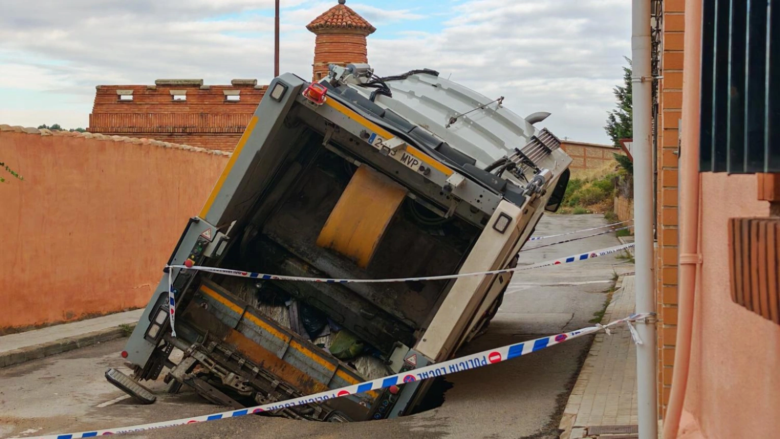 Llamativo suceso en Teruel: se hunde el suelo al pasar el camión de la basura
