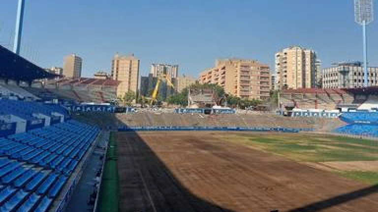 La alcaldesa Natalia Chueca, explica cómo va a ser la lona que cubra la zona en obras de la Romareda