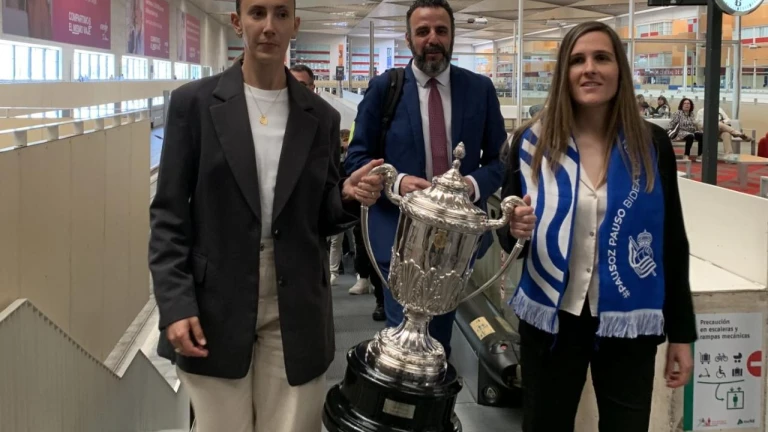 Llegada a Zaragoza de la Copa de la Reina custodiada por dos ex jugadoras de cada equipo