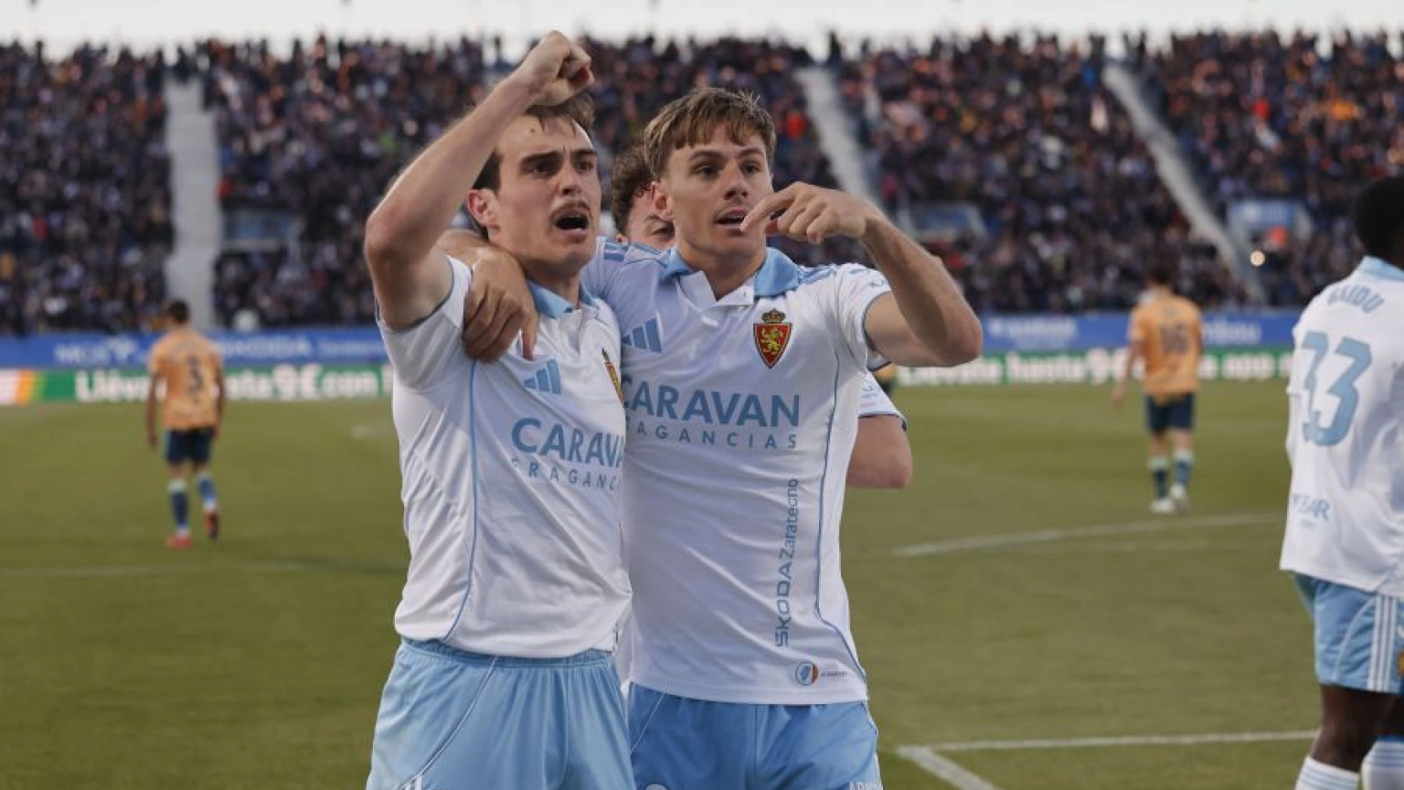 Dani Gómez, agradece a Francho Serrano la asistencia que le permitió marcar el primer gol de la tarde y abrir el camino a la victoria zaragocista