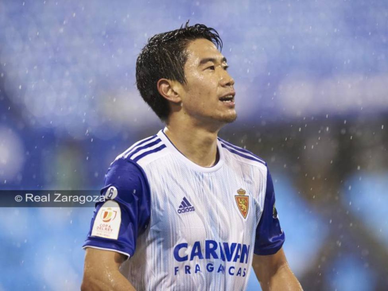 El centrocampista japonés bajo la lluvia que caía en La Romareda contra el Mallorca. | TINO GIL / REAL ZARAGOZA