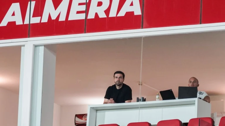 La última imagen de Gabi como entrenador del Real Zaragoza, en Almería, donde no pudo sentarse en el banquillo al estar sancionado.