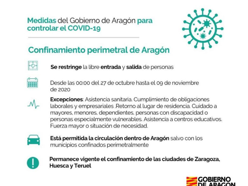 La comunidad queda confinada y no nos podremos desplazar por el resto de España. Esto no cambia la situación de las tres capitales de provincia aragonesas que a su vez, también permanecerán aisladas. Es decir, te puedes desplazar entre municipios de Aragón pero no a Zaragoza, Huesca o Teruel. En cuanto al toque de queda de momento será el establecido por el Gobierno central: de 11 de la noche a 6 de la mañana. Todas estas medidas se irán revisando semanalmente.