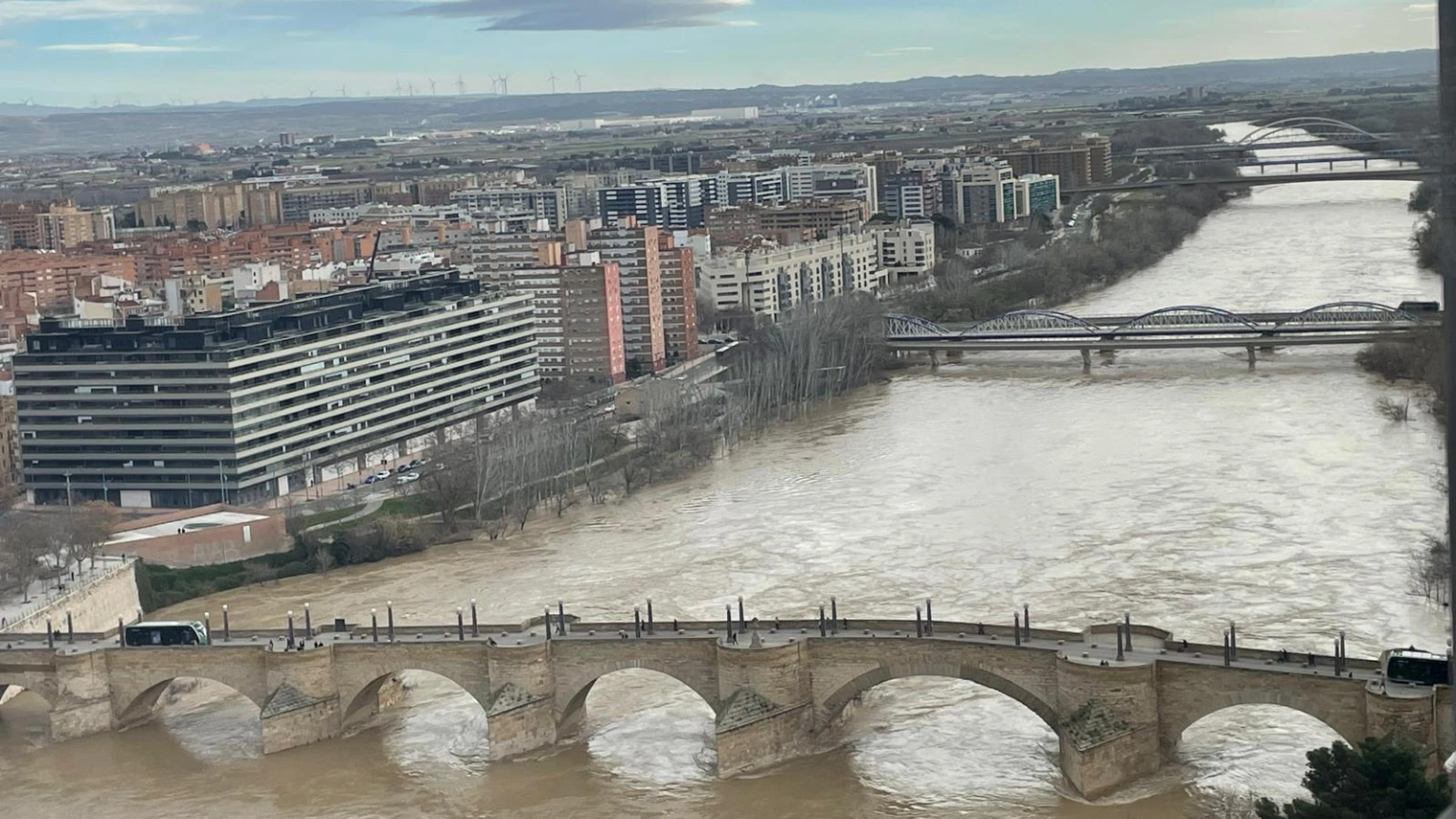 Imagen de la crecida del Ebro a su paso por la ciudad de Zaragoza.
