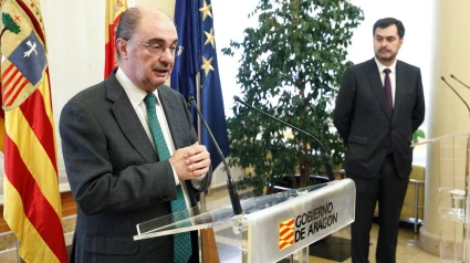 Javier Lambán y Ricardo Mur en la comparecencia de esta mañana en el Edificio Pignatelli.