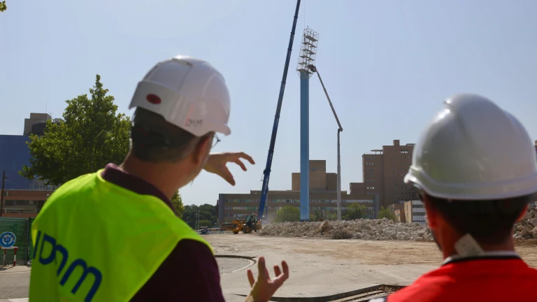 Se calcula que el proceso de retirada y derribo de las cuatro torres de iluminación del antiguo estadio municipal durará una dos semanas. Estas estructuras, de 55 metros de altura (45 metros de torre azul y 10 metros de parrilla blanca), son el último elemento que sigue en pie y un icono visual identificativo del antiguo equipamiento deportivo.