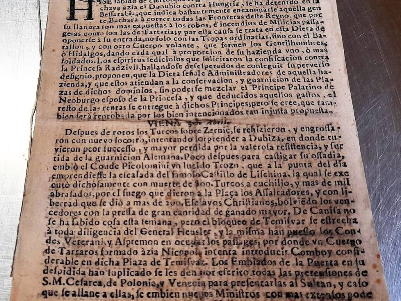 El ejemplar más antiguo que se conserva data de 1688. Eran apenas un par de páginas que, a modo de periódico, contaban las noticias más importantes que habían sucedido en Europa. "El ejemplar más antiguo son las Noticias Generales de Europa venidas a Zaragoza por el correo de Flandes. Las noticias iban a Madrid, pero de camino llegaban antes a Zaragoza. Aquí se imprimían y son una de las joyas de la Hemeroteca", afirma Betania.