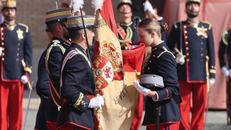 Al acercarse a la enseña nacional, se ha quitado el sombrero y ha besado la bandera. Portaba el arma reglamentaria y el uniforme que llevaba era el de etiqueta. La Princesa Leonor ha jurado bandera junto a sus compañeros de promoción en la Academia General Militar de Zaragoza, donde ha iniciado su formación castrense, en el arranque de un mes clave para su futuro como heredera del trono que coronará con la jura de la Constitución ante las Cortes el 31 de octubre.