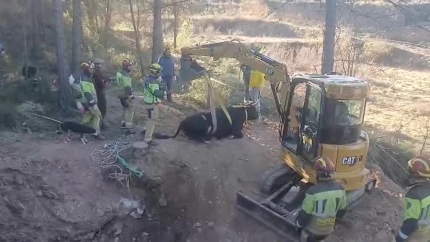 Efectivos de los Bomberos de la Diputación de Teruel han completado con éxito el rescate de una vaca que había quedado atrapada en una antigua acequia subterránea en el término municipal de Olba. La operación ha requerido el uso de maquinaria pesada para poder acceder al punto exacto donde se encontraba el animal.