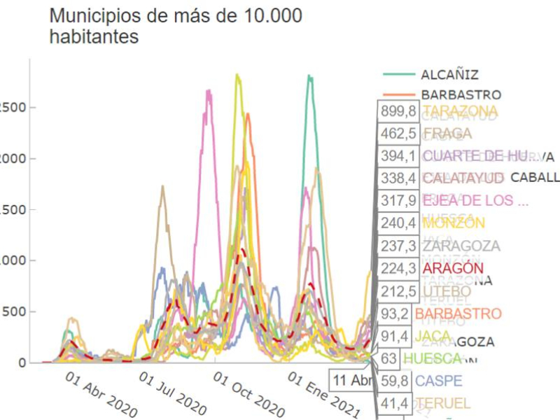 Mirando los municipios de menos de 10.000 habitantes, nos encontramos con una alta incidencia en Altorricón con 19 casos por 1.000 habitantes a 14 días, o lo que es lo mismo, 1900 casos por 100.000. Ayerbe tiene una incidencia de 1400 por 100.000. Sin embargo, al tratarse de pequeños municipios con poca movilidad y escasa afluencia de visitantes, no se contemplan medidas como el cierre perimetral. Destaca también la situación de Tauste con 1100 casos por 100.000 habitantes.
