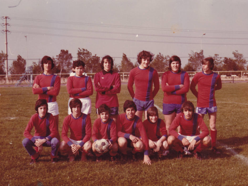 Primeros alumnos masculinos de la Universidad Laboral de Zaragoza. Foto del curso escolar de 1976-1977 con un equipo de fútbol formado por alumnos de 1º y 2º de BUP que participaron en un partido contra sus profesores. Carlos Ávila es el tercer alumno desde la izquierda en la fila superior, vestido de portero