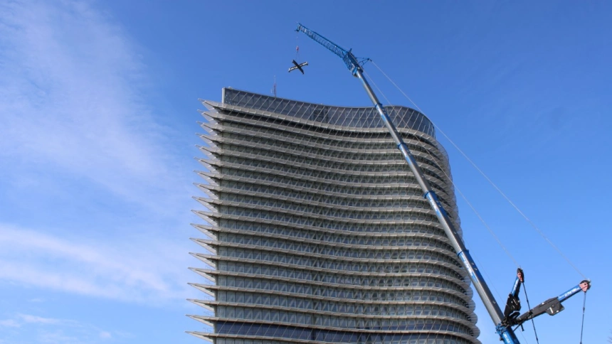 Para la colocación de esta grúa se están siguiendo las indicaciones de un riguroso informe de ingeniería, según las cuales, la grúa transfiere todo su peso a uno de los muros de hormigón estructurales del edificio, de un espesor de 40 centímetros y de forma sensiblemente circular.