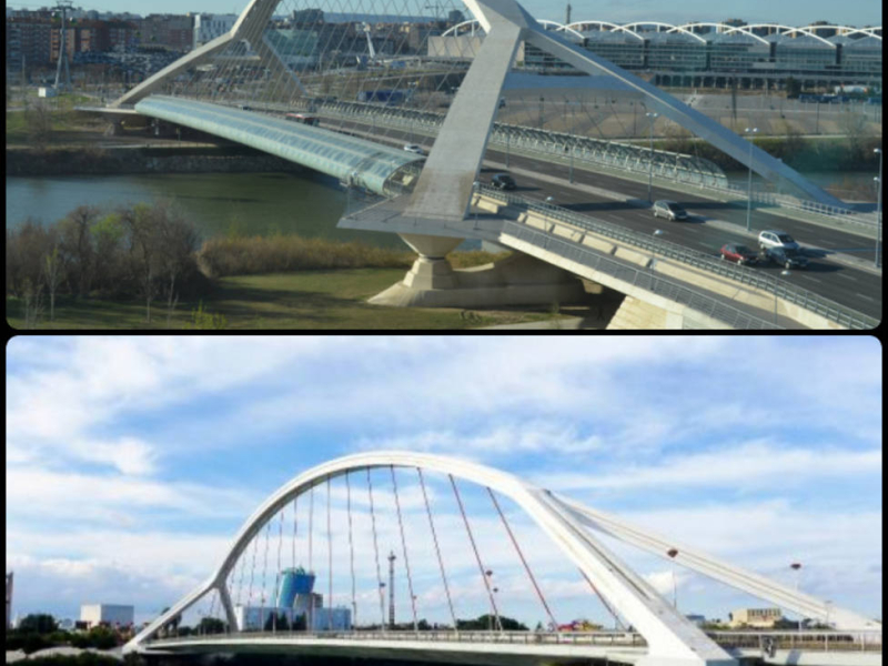 El Puente de la Barqueta se construyó en 1992 para permitir el acceso al recinto de la Exposición Universal de Sevilla cruzando el río Guadalquivir. Años después, en el 2008, Zaragoza inauguró su Puente del Tercer Milenio para acceder a la zona de su Exposición Internacional comunicando la Avenida de Ranillas con la Estación de Delicias. Mientras el puente de Sevilla nació siendo peatonal, el de Zaragoza dispuso desde un primer momento de tres carriles de circulación en cada sentido y una zona peatonal en sus extremos. El del Tercer Milenio es el puente de arco de hormigón suspendido más grande del mundo.