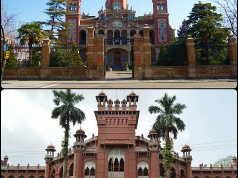El Palacio de Larrinaga es una de las construcciones más llamativas de Zaragoza por su estilo y colorido. Fue construido a comienzos del S.XX como residencia de vacaciones de los Larringa, que vivían en Liverpool. Nunca llegaron a utilizar el Palacio. Mientras eso ocurría, al otro lado del mundo, se construía la Universidad de Dhaka, en Bangladesh que se puso en funcionamiento en 1921.