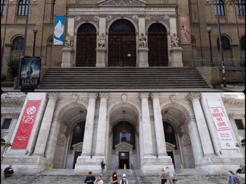 Sí, sabemos que no son exactamete idénticos pero tienen mucho en común. Los edificios del Paraninfo y de la Biblioteca de Nueva York fueron construidos practicamente a la vez y comparten sus características escalinatas, además de sus tres arcos de entrada. Mientras los intelectuales de finales del S.XIX de Zaragoza acudían al Paraninfo, los neoyorquinos veían como quedaba inaugurada su mítica Biblioteca Pública. El edificio zaragozano finalizó su construcción en 1895 y la Biblioteca Pública de Nueva York lo hizo en 1893.