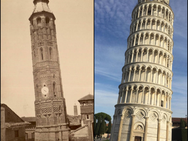 Por su parte, la Torre de Pisa es de estilo totalmente diferente al múdejar de la Torre Nueva. El monumento italiano, patrimonio de la Humanidad por la UNESCO, se construyó en el S.XI. También comenzó a inclinarse desde su construcción, pero al contrario que la torre zaragozana, la de Pisa ha podido ser estabilizada tras años de actuaciones. Se estima que ahora no volverá a moverse al menos, durante 200 años.