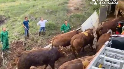 Así fue el rescate de los toros que iban en el camión que volcó en la N-234.