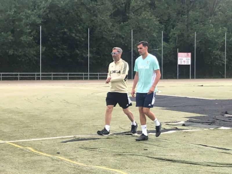 Pero el hombre que más miradas acaparó fue Jon Pérez Bolo. Estuvo acompañado por su segundo entrenador, Pablo Lago, por el preparador físico Pablo Santis y por el técnico asistente Asier Díaz, completando el cuerpo técnico Sergio Segura como preparador de porteros y Michi Menéndez como readaptador. El técnico vasco delegó en sus ayudantes en este primer día gran parte de la sesión, excepto en los minutos finales, donde se le vio metiendo intensidad a los jugadores en la última tarea. La sesión se prolongó durante más de una hora. Arrancó con estiramientos y calentamiento y posteriormente entró el balón como protagonista.Varias ruedas de pase, unos rondos y un ejercicio de conservación de balón fueron las tareas diseñadas para la primera toma de contacto, con los tres porteros trabajando por separado respecto al resto del grupo. El presidente Jorge Menéndez Vallina y el director deportivo Tito Blanco estuvieron presentes durante toda la sesión, así como César Martín.