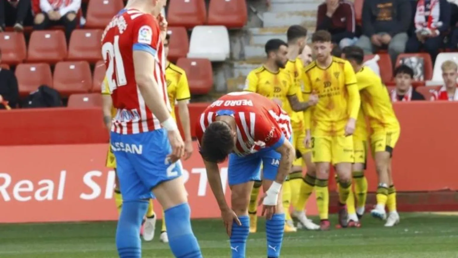 Todavía aturdido por el golpe, el Sporting se salvó del tercer gol con un paradón de Cuéllar a Gelabert. Esa jugada espoleó a los rojiblancos, que recortaron distancias en el minuto 35. Pedro Díaz conectó un remate duro y seco desde la frontal para batir a Alfonso Herrero y colocar el 1-2 en el luminoso con el que se llegaba al descanso.
