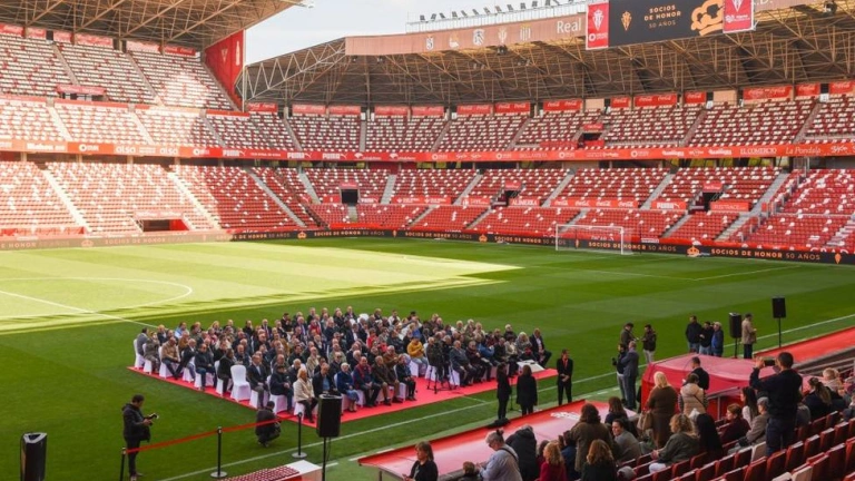 El Real Sporting homenajeó a los socios con más de 50 años de fidelidad a la entidad en un acto en El Molinón que contó con la presencia de David Guerra, presidente ejecutivo, Joaquín Alonso, director de relaciones institucionales del club, Miguel Ángel Ramírez, entrenador y una representación de los capitanes, con Djuka y Jony al frente.