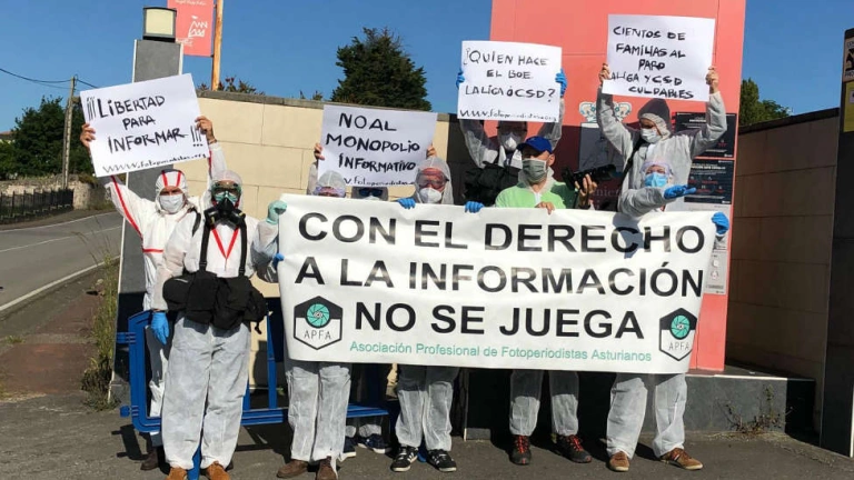 "No al monopolio informativo" ha sido el grito de protesta de los fotoperiodistas asturianos esta mañana a las puertas de la Escuela de Fútbol de Mareo. Estos profesionales de la información se han manifestado en contra de la decisión de LaLiga de no permitir su entrada en los entrenamientos de los equipos de Primera y Segunda, en principio, hasta el final de la actual temporada, por las condiciones de prevención y seguridad que rodean a los clubes de fútbol. La propia patronal, en colaboración con los equipos, se encarga de difundir el material informativo de cada jornada de trabajo en las ciudades deportivas.