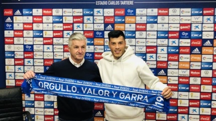 El atacante argentino, primer fichaje del Real Oviedo en este mercado invernal, ha sido presentado de forma oficial en la sala de prensa del Carlos Tartiere.