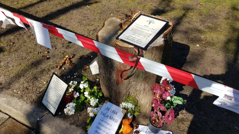 Un altar con flores, cartas y una esquela junto al tronco del castaño de indias recuerda la tala: “Lo mataron el 3 de septiembre”, reza el texto, que añade que “los vecinos del barrio ruegan mantener el recuerdo de su sombra, de su generosidad con ellos y con las aves del barrio”. Una protesta ‘macabra’ que no ha gustado.