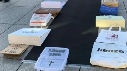 La plataforma “De Compras por Avilés” ha escenificado en la Plaza del Ayuntamiento la muerte de sus negocios debido al cierre decretado por el Principado. Lo ha hecho colocando una gran cruz sobre el suelo y sus pies, en una urna, las llaves de sus establecimientos.