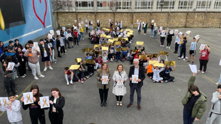 Un grupo de alumnos ha formado un gran lazo y han leído un manifiesto de apoyo para esta enfermedad que afecta a 30 niños al año en Asturias