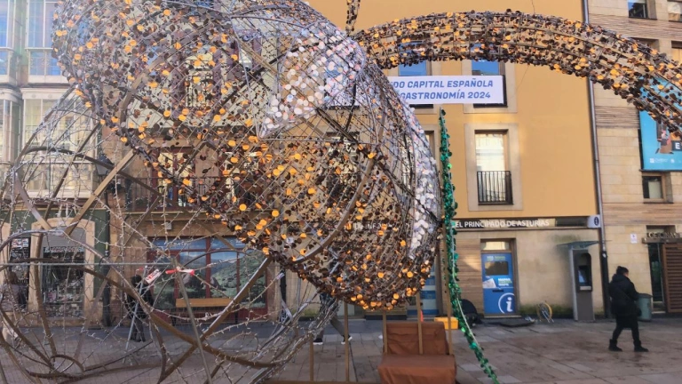 Se acerca el encendido de la iluminación navideña en Oviedo y las instalaciones ya están listas en varios puntos de la ciudad. Una de ellas, en la Plaza del Ayuntamiento. Ahí luce una novedosa figura que llama la atención de todo aquel que pasa por la zona. Los corrillos son habituales estos días intentando averiguar de qué se trata: "Es una bellota" dicen algunos. "Un paraguas" dicen otros. Y hasta alguno plantea opciones como un saxofón o un tobogán. Pero lo cierto es lo primero. Se trata de una bellota.