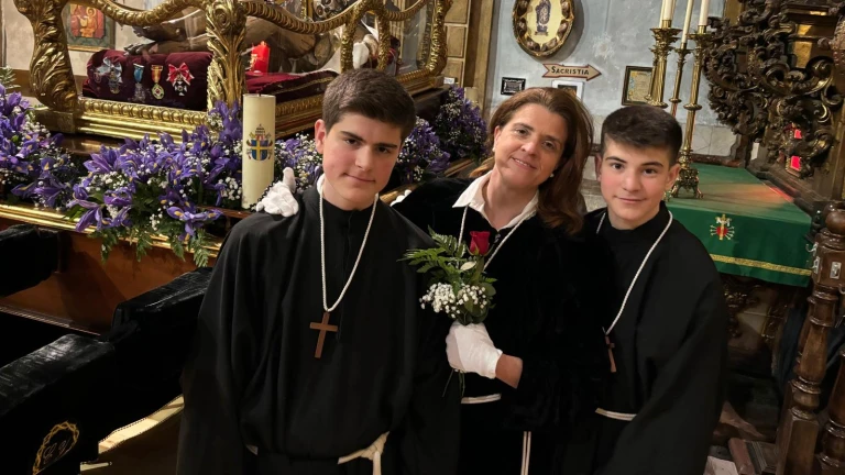 Mónica inculcó la pasión por la Pascua a sus hijos desde muy pequeños: han sido Morabetinos y, actualmente, siendo adolescentes, uno forma parte del Ecce Homo y el otro procesiona con la Dolorosa y el Santo Entierro