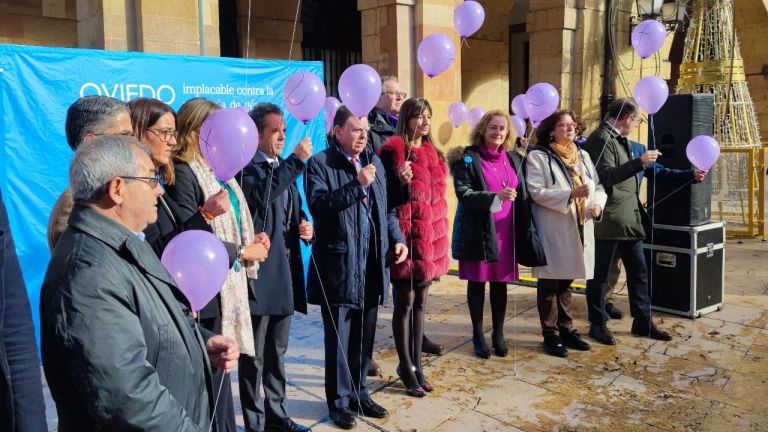 En Oviedo, el ayuntamiento celebró una concentración a mediodía en la que, tras guardar un minuto de silencio, se dio lectura al manifiesto elaborada por la Federación Española de Municipios y Provincias, y se soltaron 38 globos morados, uno por cada una de las 38 mujeres asesinadas este año a manos de sus parejas o ex parejas.