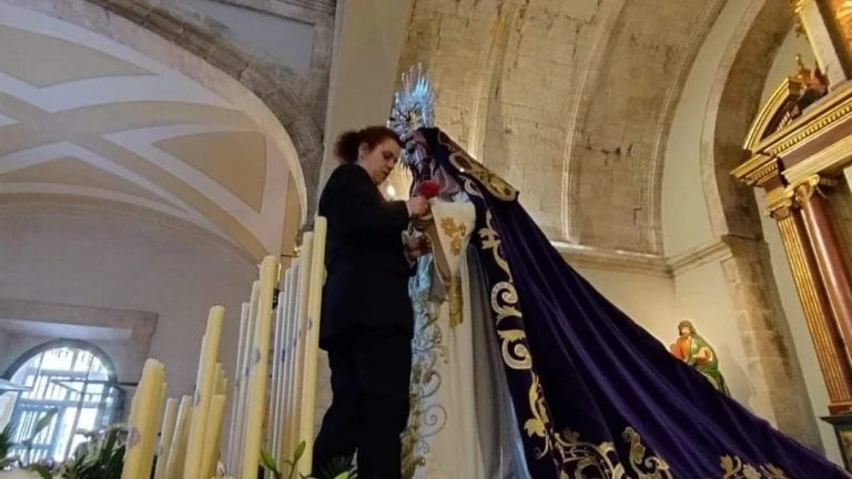 Ella es Patricia Frechilla y es la encargada de vestir a la Virgen de la Amargura. Adaptan su vestimenta según la liturgia, lo hacen en silencio, cuando ya no queden feligreses... casi en la clandestinidad. Para Patricia, "es un momento muy íntimo, hay una conexión". En realidad, le surge la duda de quién encontró a quién.