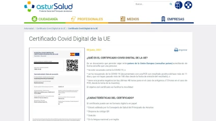 A partir de este jueves se podrá solicitar cita para obtener el "Certificado Digital Covid UE" de vacunación a través de la web de Astursalud