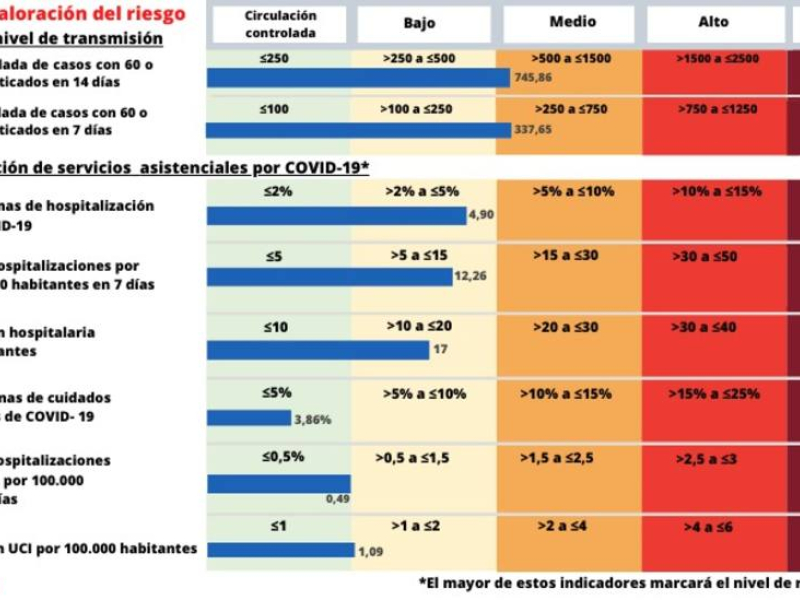 Los seis relacionados con la ocupación asistencial son los que determinan el nivel de riesgo por covid. Las tasas de ocupación muestran la evolución de la pandemia en la población, mientras que los porcentajes son indicadores de la presión asistencial en el Sistema de Salud en un momento determinado.