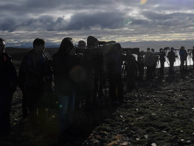 Ornitólogos, fotógrafos y curiosos observan al ejemplar de búho nival (Bubo scandiacus) localizado en Cabo de Peñas (Asturias) este miércoles. El búho nival nunca se había visto en España, pero en los últimos días se han avistado al menos tres en Cantabria y Asturias. EFE/ Eloy Alonso