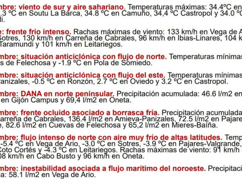 El día más frío del otoño fue el 27 de noviembre y la mínima la marcó Vega de Ario con -5,4 grados. Tres días antes, el 24 de noviembre, fue el que más precipitaciones cayeron sobre el Principado y la mayor marca la registró Carreña de Cabrales donde se recogieron 108 litros por metro cuadrado. Ese día, el nivel de los ríos subió de forma considerable y fue necesario evacuar a los pacientes ingresados en el Hospital 'Grande Covián' de Arriondas ante la crecida del río Sella.