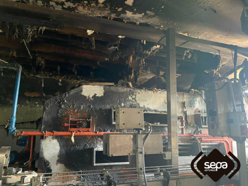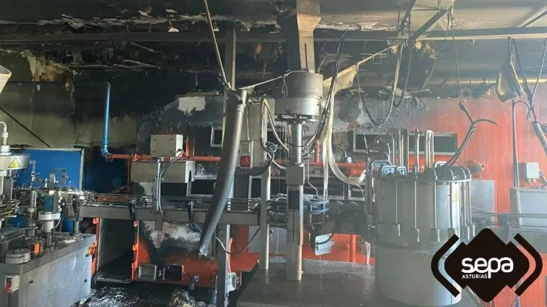 Efectivos de Bomberos del Servicio de Emergencias del Principado de Asturias (SEPA), con base en el parque de La Morgal, han sofocado este martes un incendio declarado en una máquina de lavado de botellas de un llagar ubicado en Tiñana, Siero.