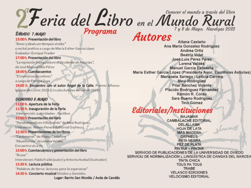 El Ayuntamiento de Tineo, a través de la Casa de Cultura de Navelgas, organiza en Navelgas los próximos sábado 7 y domingo 8 de mayo, con la colaboración de la Asociación Cultural El Arbedeiro y del Centro Público de Educación Básica “Príncipe Felipe”, la segunda edición de la Feria del Libro en el Mundo Rural.