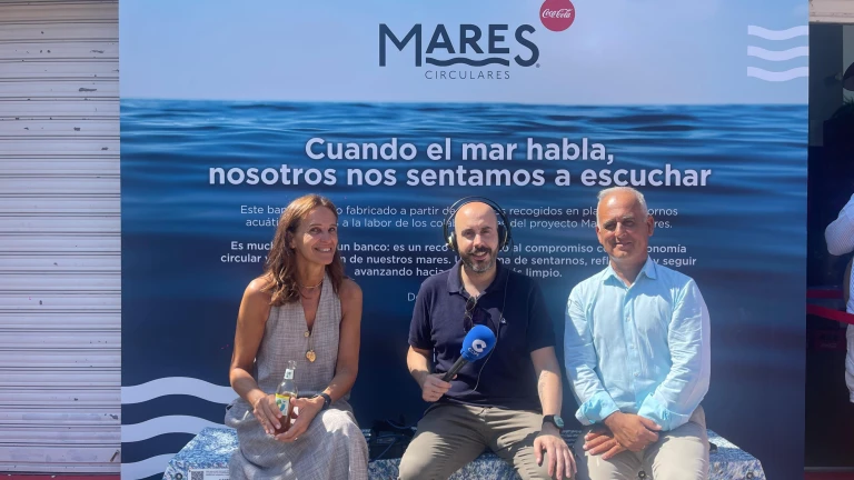 Y para muestra, un botón: a la entrada del stand, un banco recibe a los visitantes. No es un banco cualquiera, es un banco fabricado a partir de plásticos recogidos en playas y entornos acuáticos con el proyecto Mares Circulares.