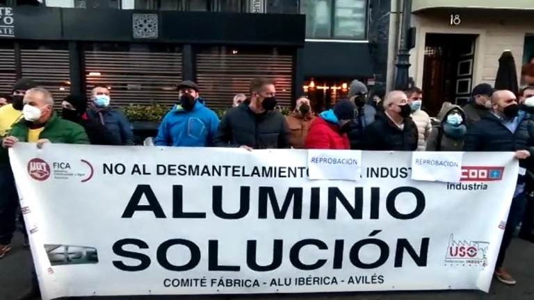 Trabajadores de Alu Ibérica se han concentrado, este miércoles, a las puertas de la Junta General del Principado, donde tiene lugar un pleno extraordinario para analizar la actuación del Gobierno regional en el conflicto de la aluminera. Pleno en el que se votará la reprobación del Consejero de Industria, Enrique Fernández, al que la plantilla acusa de no haber hecho nada por salvar la factoría avilesina.