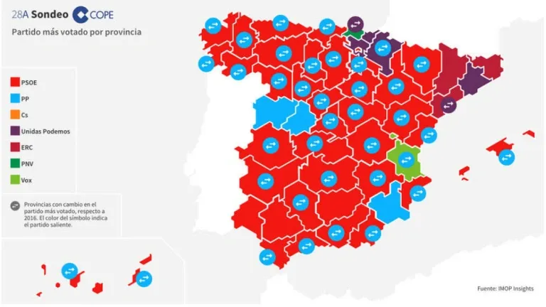 En el conjunto de España, el PSOE ha ganado las elecciones generales, pero Pedro Sánchez dependerá de Podemos y las fuerzas independentistas para mantenerse en la Moncloa.
