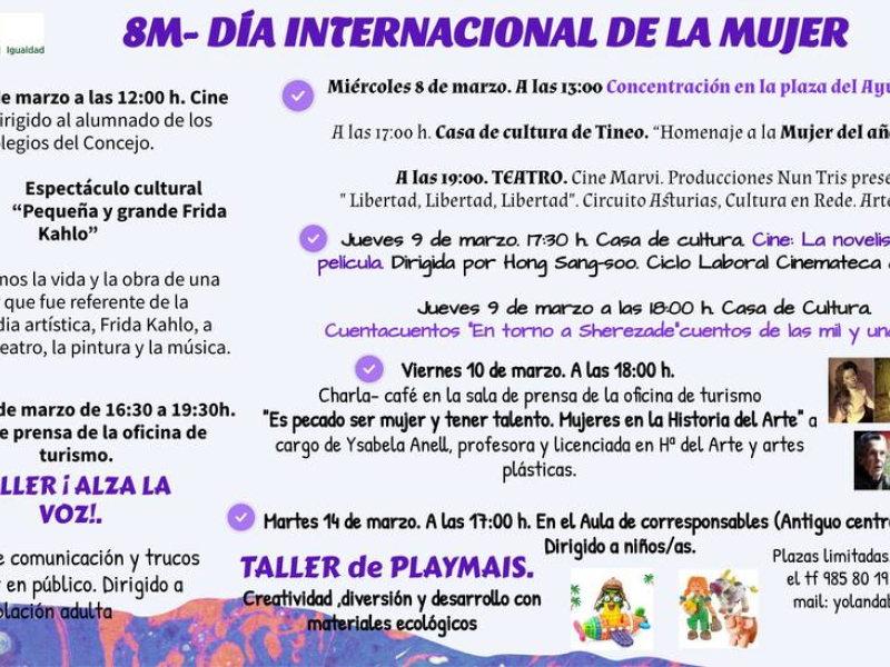 El miércoles 8 de marzo, a las 13 horas habrá una concentración en la plaza del Ayuntamiento para conmemorar el Día Internacional de las Mujeres y por la tarde, a las 17 horas, se celebra, en la Casa de Cultura, el acto de homenaje a la mujer del año en Tineo. A las 19 horas, en el Cine Marvi, la compañía asturiana Producciones Nun Tris presenta la obra teatral "Libertad, Libertad, Libertad".