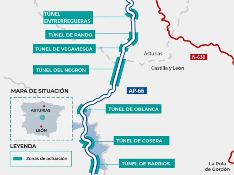 El Ministerio de Transportes, Movilidad y Agenda Urbana (Mitma) ha formalizado por 68,1 millones de euros (con IVA) el contrato de obras para la modernización de los túneles de Barrios, Cosera, Oblanca, El Negrón, Vegaviesga, Pando y Entrerregueras, todos ellos ubicados en la autopista AP-66 Campomanes-León, en Asturias y León.