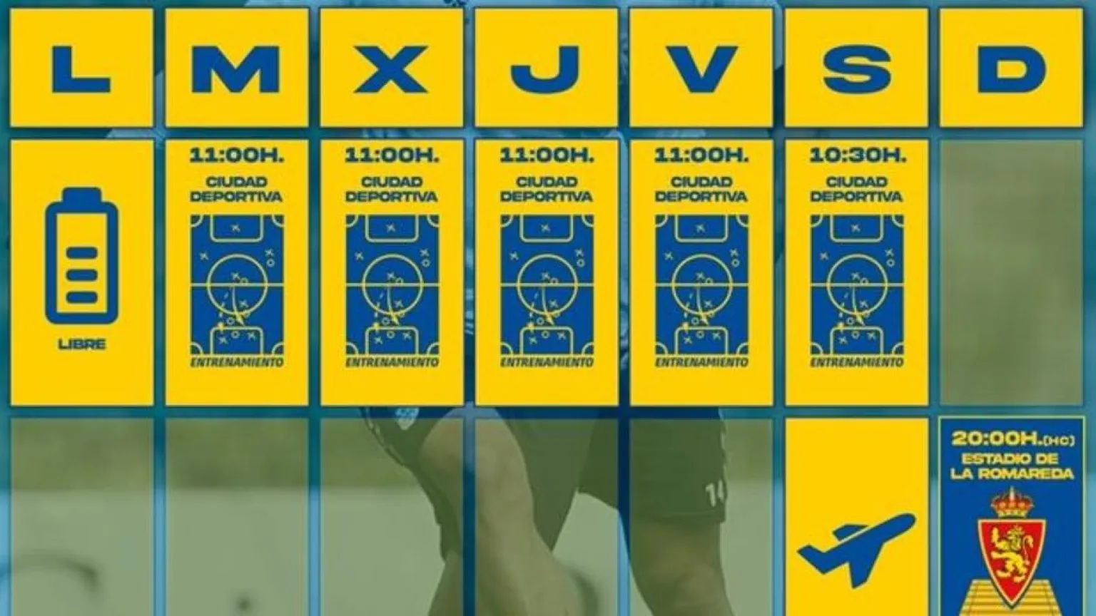 El miércoles, jueves y viernes, el entrenamiento del equipo grancanario se realizará en la Ciudad Deportiva, a las 11 horas, y el sábado será a las 10.30 horas. El encuentro de la jornada 38 de la actual campaña en la Liga SmartBank se disputará el domingo, a las 20 hora canaria, en La Romareda.