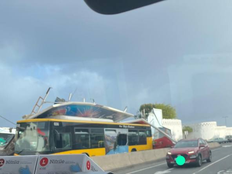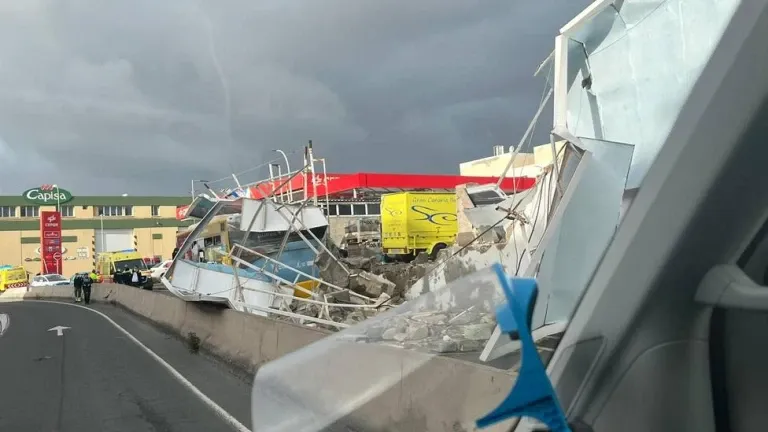Un muro ha caído sobre una guagua en la carretera del Cardón, en Las Palmas de Gran Canaria, sin causar lesionados de gravedad debido a los fuertes vientos que están soplando este lunes en la capital grancanaria, que se encuentra en aviso por rachas de hasta 90 kilómetros por hora, según ha informado la Policía Local.