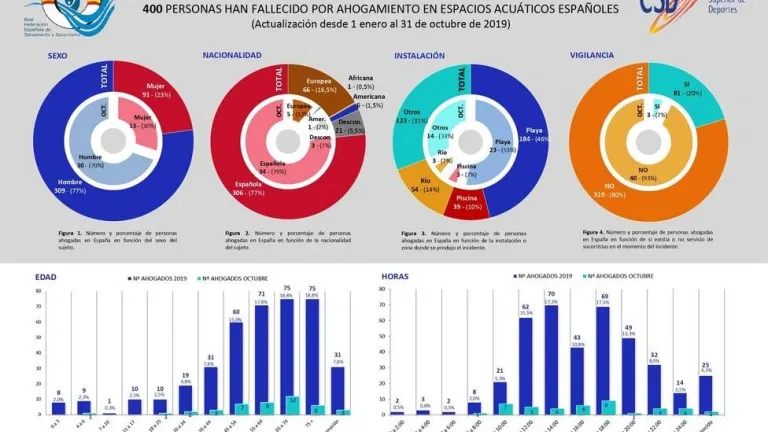 En el global de 2019, completa el perfil de la persona ahogada un varón de nacionalidad española (77% en ambos casos), que pierde la vida en un tramo horario que comprende entre las 10 y las 20 horas, (73,3%), durante el uso de una playa (46%) o, en cualquier caso, de un espacio acuático no vigilado (80%).